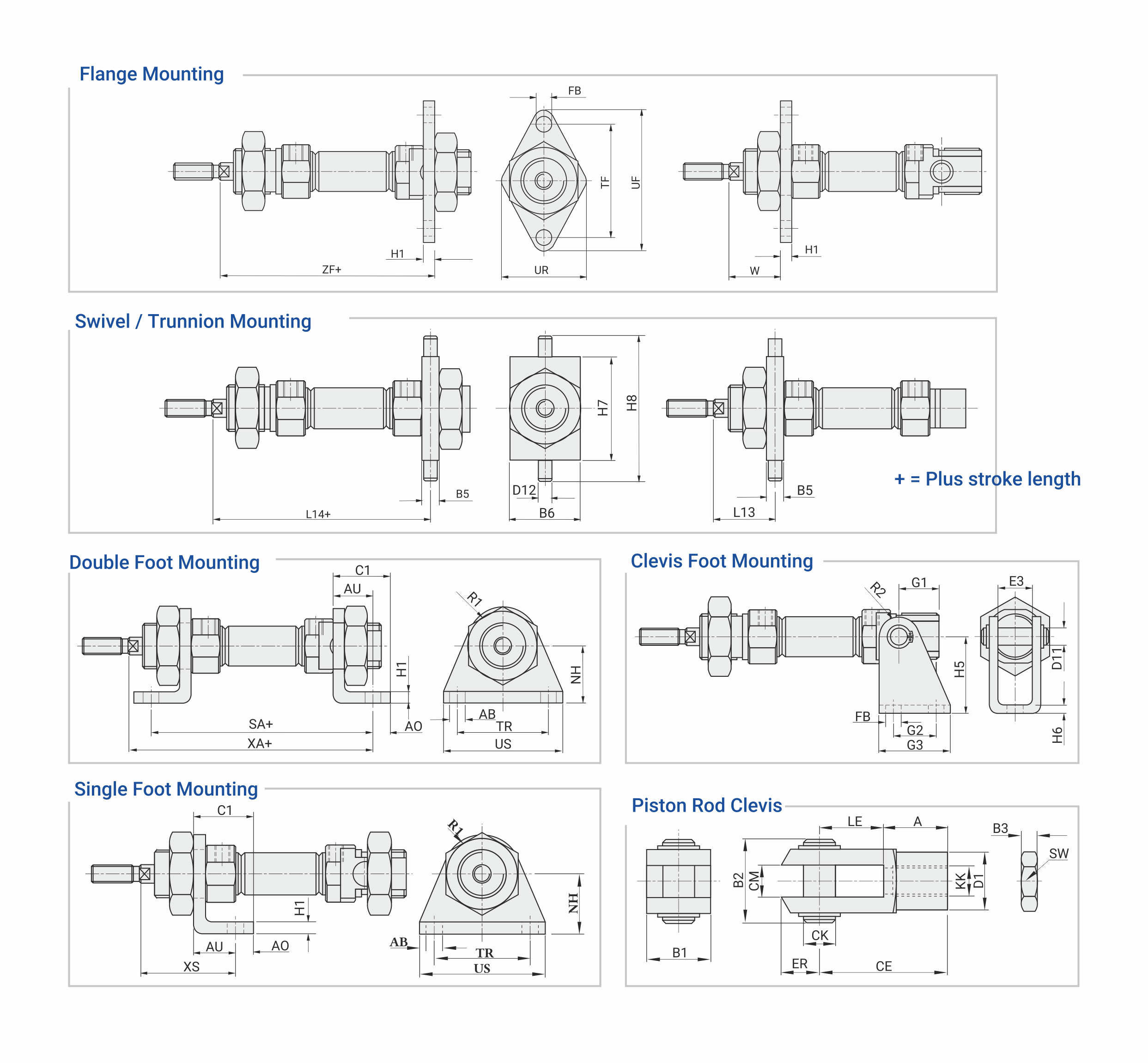 | Piston Dia. mm | A | AB Ø | AO | AU | B1 SQ | B2 | B3 | B5 | B6 | C1 | CE | CK Ø | CM | D1 Ø | D11 Ø | D12 Ø | E3 | ER | FB Ø | G1 | G2 | G3 | H1 |