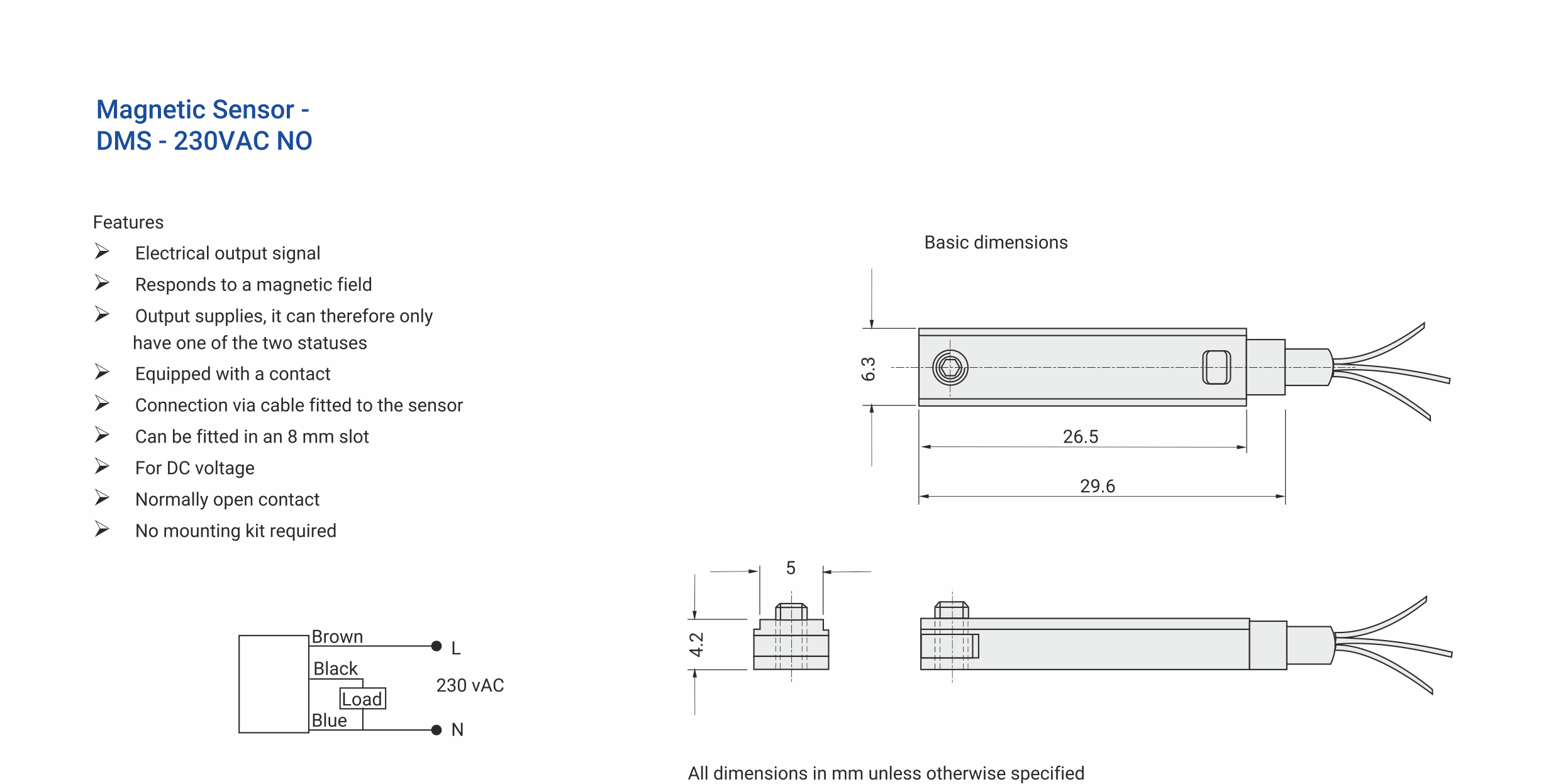 Electrical output singal Responds to a magnetic field Output supplies, It can therefore only have one of the two statuses. Equiped with a contact Connection via a cable fitted to The sensor Can be fitted in an 8 mm slot For DC voltage Normally open contact No mounting kit required